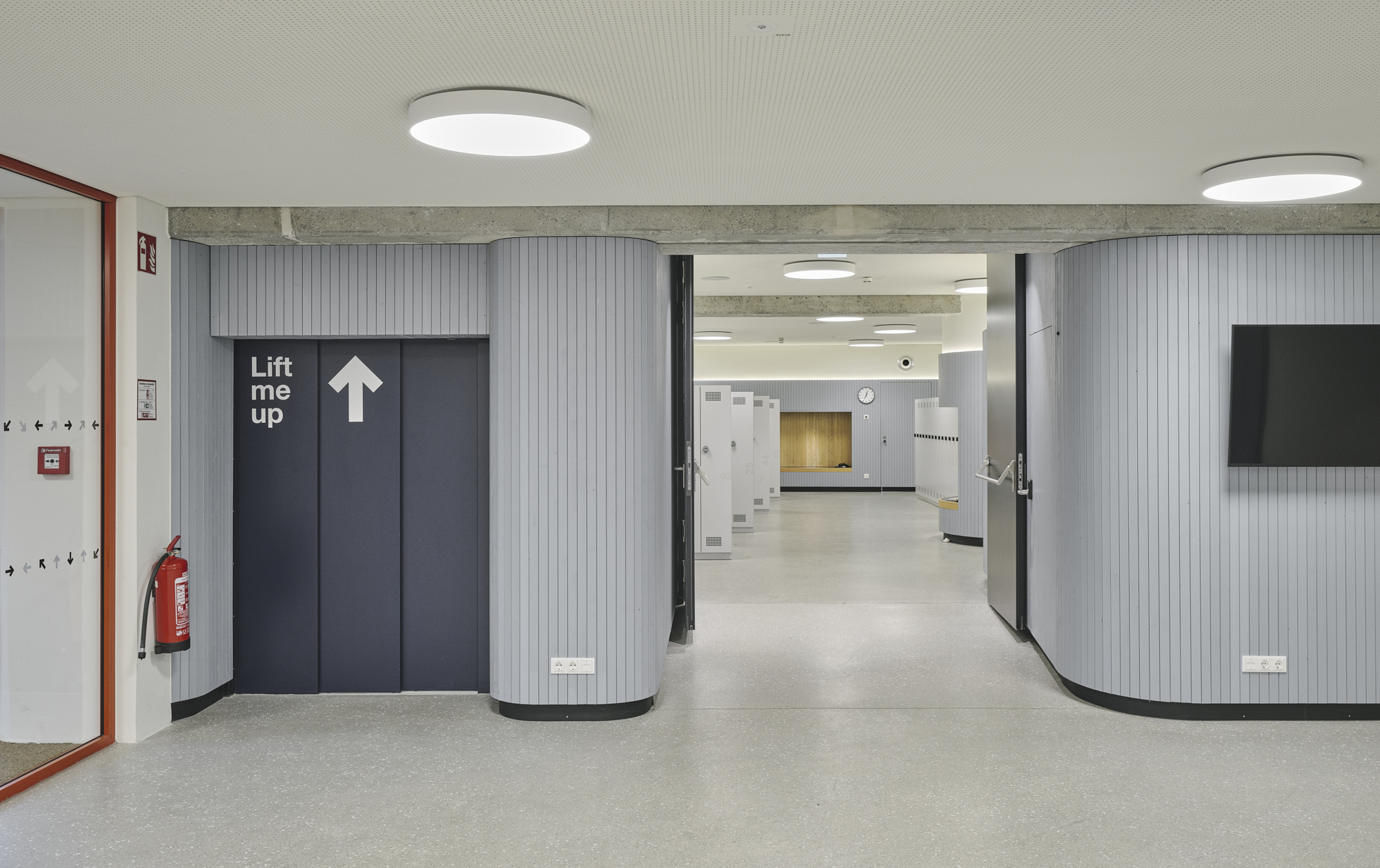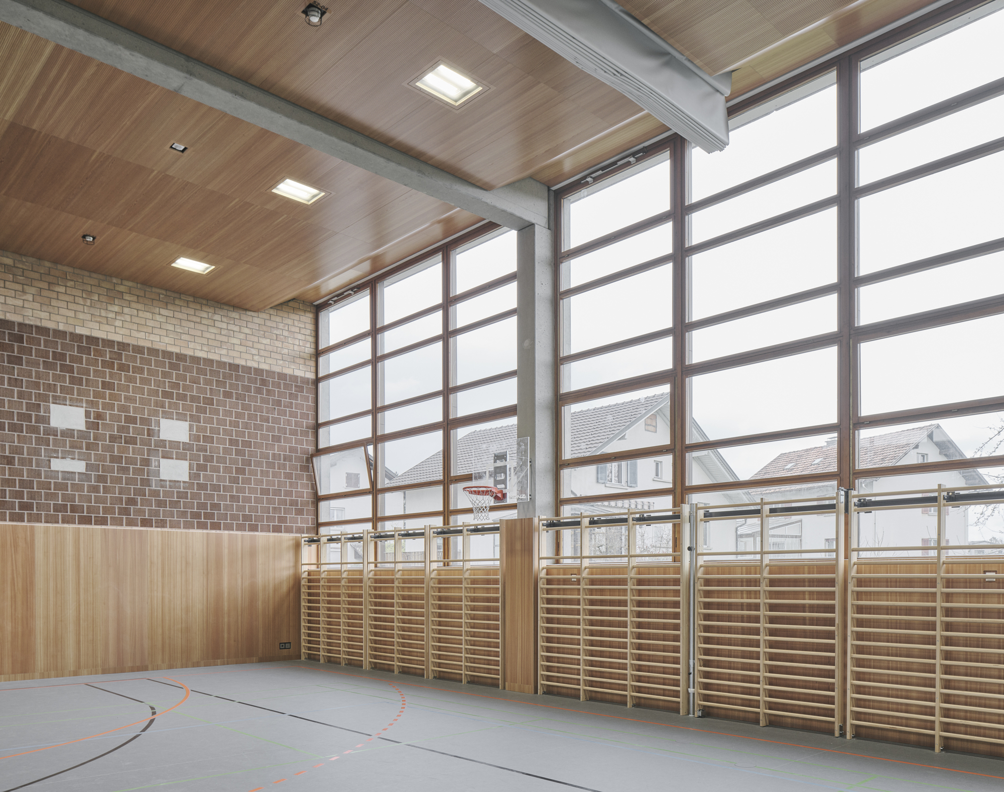 Die große Dreifach Sporthalle wurde behutsam mit dem Bestand saniert und erhielt einen duneklgrauen Sportboden. Die dazugehörigen Nassräume, Garderoben und Versorgungsräume wurden in das Farbkonzept eingebunden.